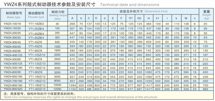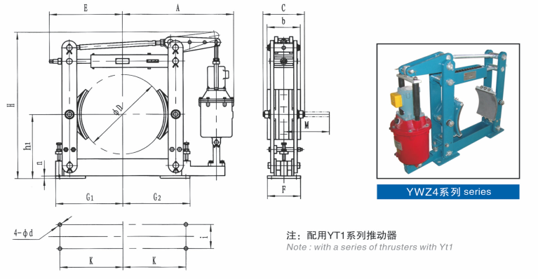 YWZ4系列電力液壓鼓式制動(dòng)器連接尺寸和制動(dòng)力矩參數(shù)符合JB/ZQ4388-86標(biāo)準(zhǔn),技術(shù)要求符合JB/T6406-2006標(biāo)準(zhǔn);